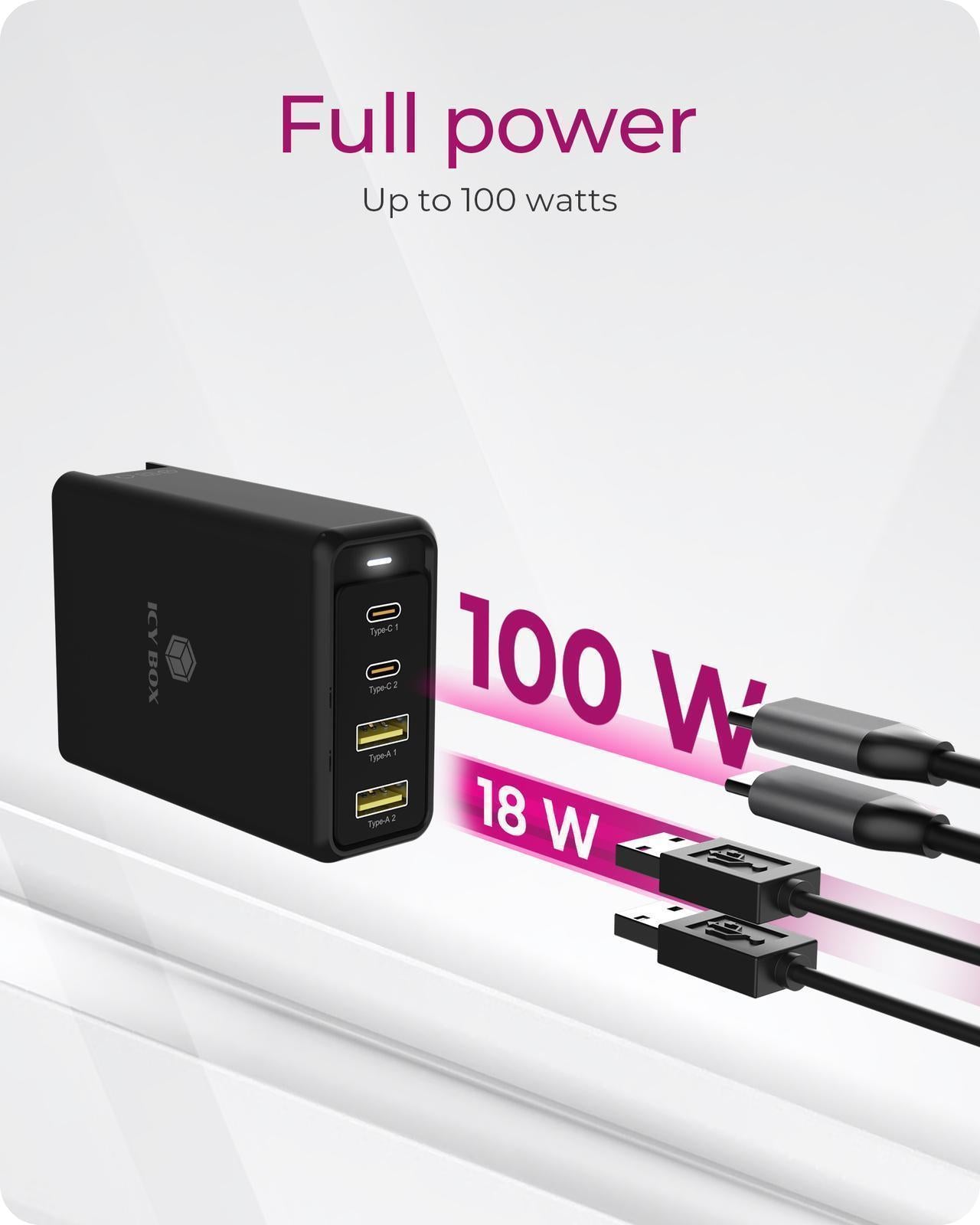 Do you also think about which chargers you need for your mobile devices before a trip? With the IB-PS104- PD from ICY BOX you are now well equipped! The handy charger has 2x USB Type-C® and 2x USB Type-A ports and can charge up to four devices simultaneously.