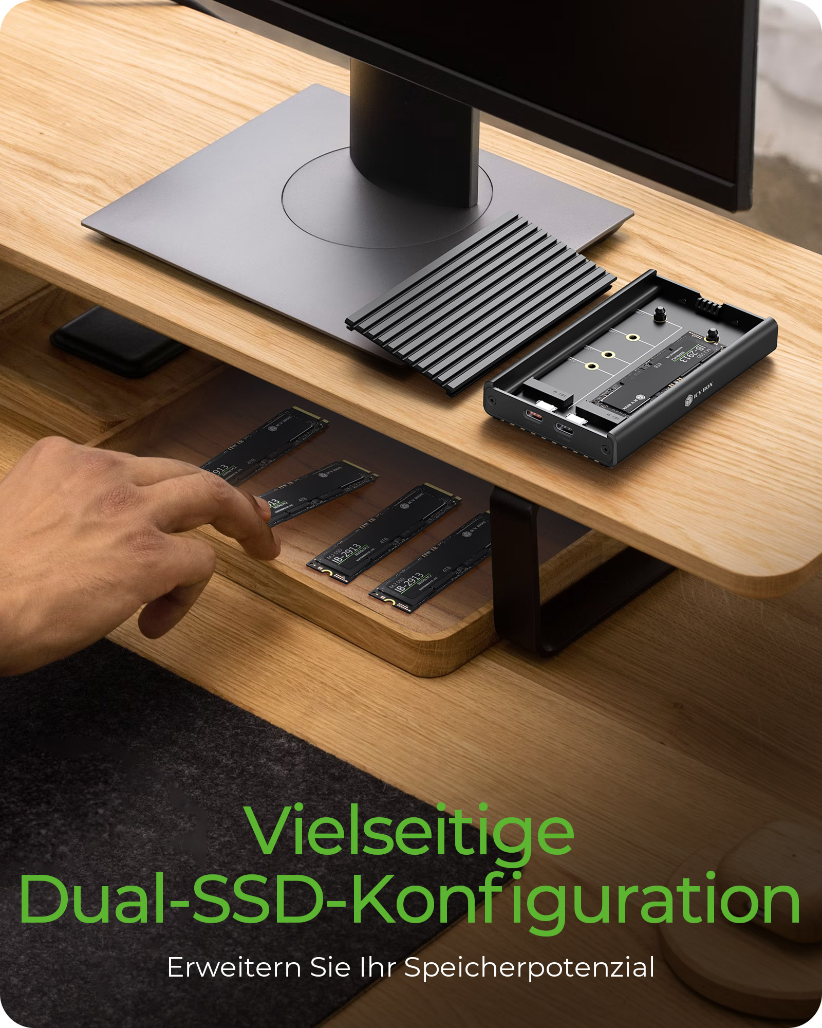 Vielseitige Dual-SSD-Konfiguration - Kompatibel mit M.2 SSD-Längen von 2230 bis 2280 bietet dieses Gehäuse Flexibilität bei den Speicheroptionen. Es ist ideal für professionelle Arbeitsstationen und persönliche Computerbedürfnisse und gewährleistet zuverlässigen Datenzugriff.